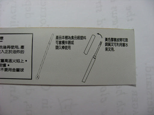 Fig 3.使用說明。調"久"棒,有錯字。"黃色膠套拔開可現鋼質叉可利用當水果叉用",這說明的文法還真強悍。